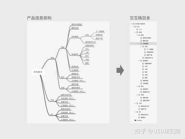 交互稿的结构,应该根据产品信息架构搭建。比如下图是网易云音乐“本地音乐”模块的信息架构和交互稿目录,由产品信息架构可以推导出交互稿目录。可以发现这种一一对应的交互稿目录结构,非常清晰易懂。